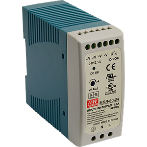 MeanWell 60 W/2.5 A DIN-rail 24 VDC singel output industrial power supply, universal 85 to 264 VAC or 120 to 370 VDC input voltage, -20 to 70°C operating temperature